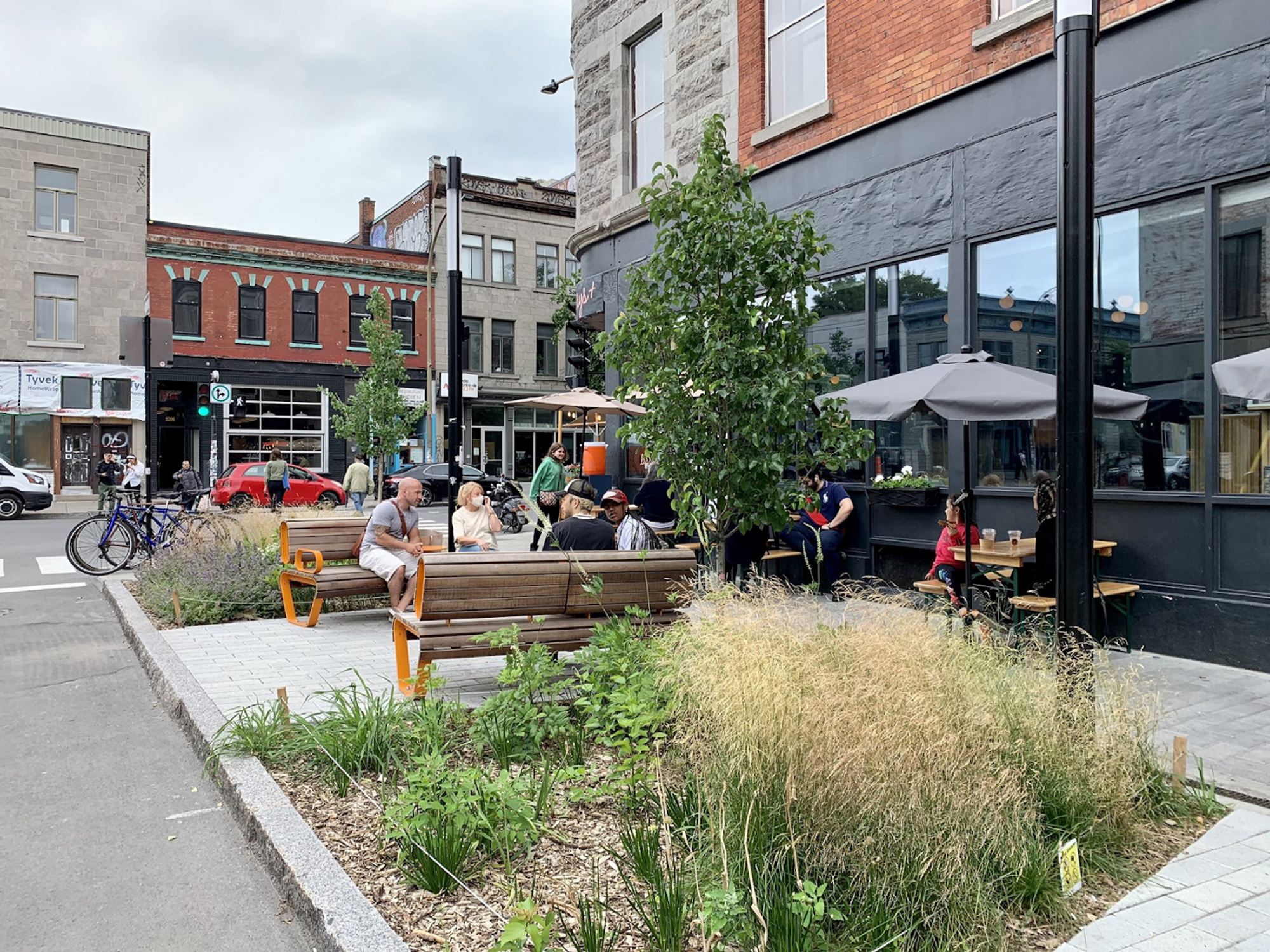 In big cities like Montreal and small towns like Batesville, Indiana, communities are looking for ways to break up large swaths of heat-trapping concrete with more landscaping, shading, and spaces for people. In many places, they’ve taken existing street parking spaces and converted them into spaces for people to sit and enjoy the day while also serving as spaces to mitigate the impacts of both extreme heat and extreme rain events.