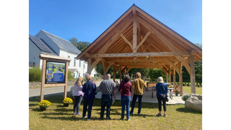 This plan included a 24' x 48' timber frame pavilion. The pavilion was built on an existing slab where a double-wide trailer once stood. The pavilion was created in the Spring of 2022 by Vermont Natural Homes in their 18th-century barn in West Townsend, Vermont, and built with wood harvested from southern Vermont and northern Massachusetts. In February 2023, the pavilion was raised with an audience of over 100 excited community members. $100 patrons could sign a pin and hammer it into place to cement their contribution to the campaign.
